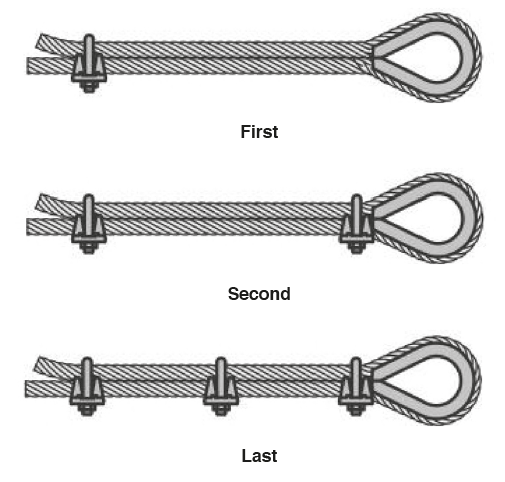 The following clips should be placed on the wire rope between the first and second clip in such a way that they are seperated by at least 1 ½ times the clip-width with a maximum of 3 times the clip-width.